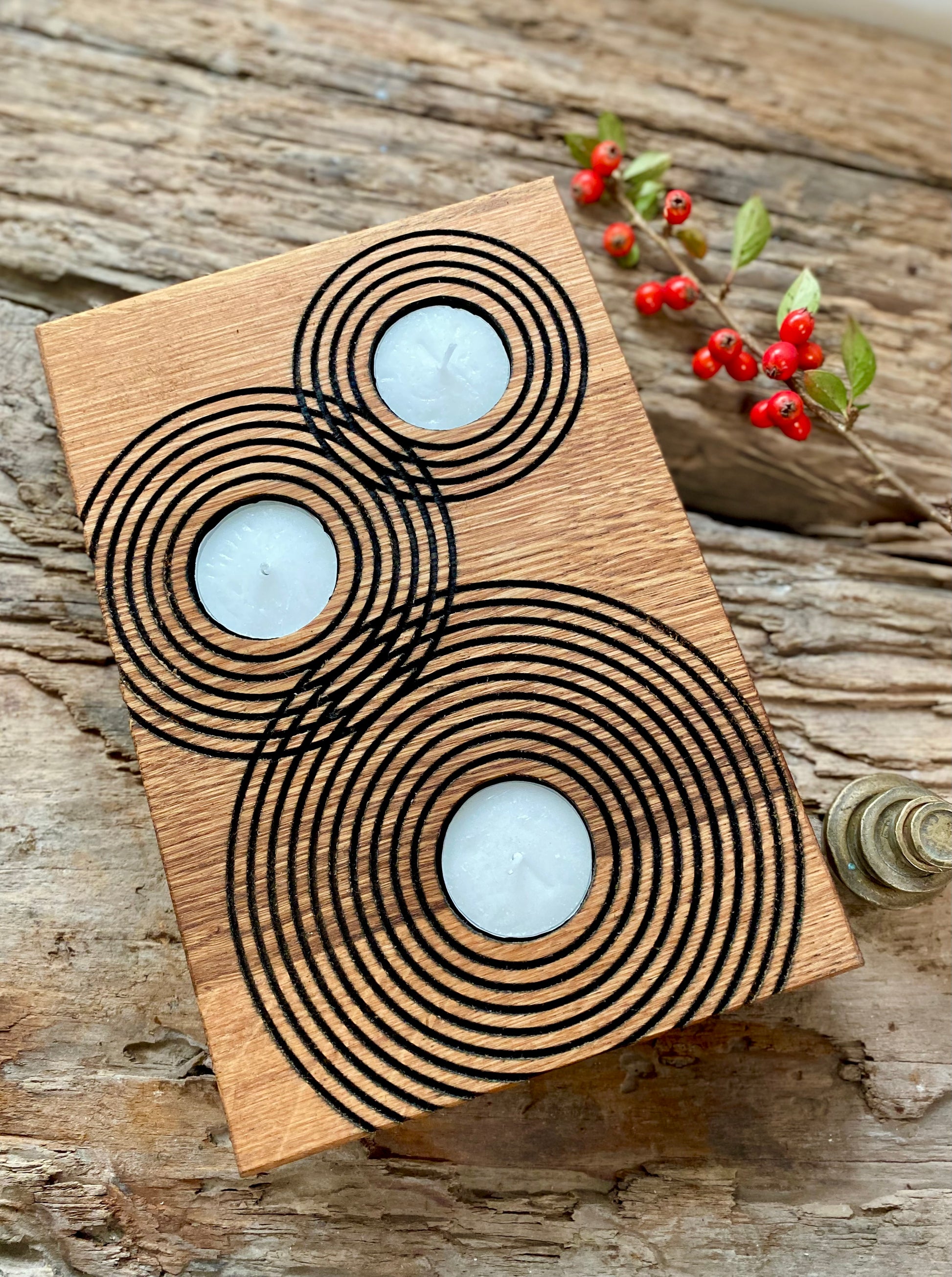 Elevate your living space with the Argonauts Ripple design oak candle holder—an exquisite blend of rustic charm and modern craftsmanship. This triple tea-light holder is precision-crafted to showcase a stunning overlapping geometric pattern, making it the perfect centerpiece for your coffee table or dining area.